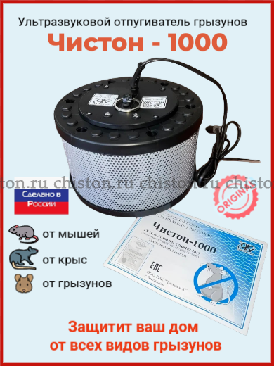 Ультразвуковой отпугиватель грызунов (дератизатор) «Чистон-1000» мощное и эффективное средство для отпугивания крыс, мышей и прочих грызунов в бытовых и производственных помещениях. Отличительной особенностью прибора является мощный, широкополосный, высокоэффективный излучатель с пьезокерамическим актюатором типа «пакет Ланжевена», управляемый высоковольтным генератором с микропроцессорным управлением. Конструкция прибора защищена патентом на изобретение Р.Ф. за номером RU 2722534 C1.